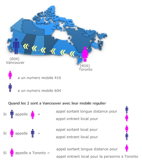 C'est la localisation physique du téléphone mobile qui fait en sorte qu'un appel sortant ou entrant sera considéré « longue distance ». Par exemple, si vous avez un téléphone avec le code 416 (Toronto, Canada) et que vous visitez un ami dans la zone 604 (Vancouver, Canada), tous vos appels vers un numéro 604 ou reçus de numéros 604 seront locaux. Dans le même ordre d'idées, tant que vous vous trouverez dans la zone 604, tous vos appels vers les numéros 416 et reçus en provenance de numéros 416 seront considérés comme étant longue distance.